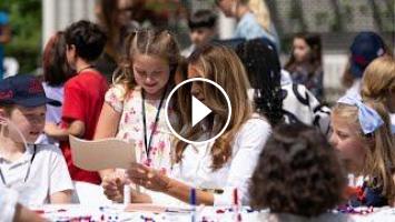 First Lady Melania Trump welcomed children to the White House with a patriotic arts and crafts activity in the Kennedy Garden as part of the White House’s annual Take Our Daughters and Sons to Work Day celebration.